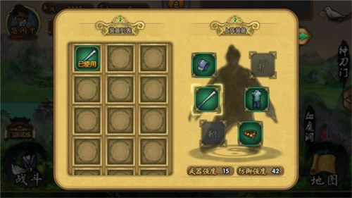 这张装备界面包含护、盔、器、铠、靴、佩六类装备,每类装备都在独立分栏中展示。例如刚获得的衣服和武器,需要分别点击右侧的铠甲框与兵器框才能看到这两件装备,之后点击左侧的装备选项即可使用!