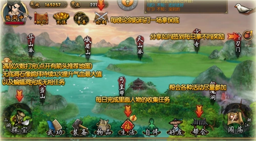 如图所示,设有每日建议完成的必做环节。此外需要提醒的是,进入各大地图场景后,江湖副本会定时开启。同样地,参与门派试炼有一定概率掉落江湖秘极、属性丹等稀有道具。