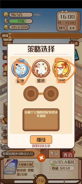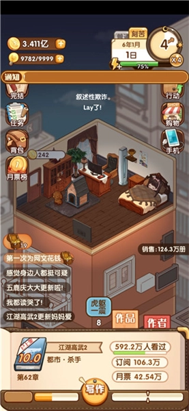 2、buff加成选两个写作速度,各提15%,再选“虎躯一震”——写完两章后有概率回体力。等买到第四套房子,靠这加成就能全天“刻苦”写作,同时刷满灵感;灵感满了之后,多余体力就去【行动—赚钱】刷题材。金手指和电脑都拉满的话,写作速度基本能稳定在1753左右,一个多月就能写完一本102章的作品(写到98章选完结拿完结奖励),卡在月中完结开下一本,基本能拿月末的一二等奖。