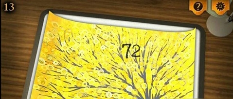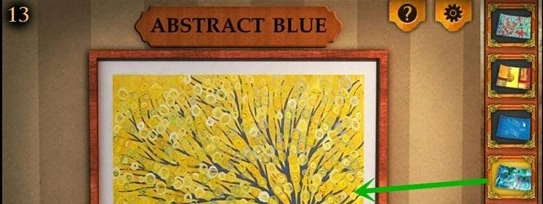 4、接下来我们把左侧墙上那幅黄色的画和之前拿到的蓝色画互换位置,然后把取下来的画和其他画一同放在桌上,用台灯照射,就能看到画上显现出数字提示了。