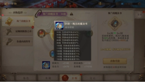 当所有部位达到指定阶级后,就能对圣物进行升阶操作,从而解锁伤害减免的被动技能。目前圣物的最高等级为150级,此时伤害减免效果可提升至73%。