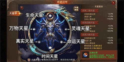 当六颗天星全部点亮后,即可解锁酷炫外观【奇幻星龙】与强力技能【龙魂吐息】。【龙魂吐息】技能效果为:当生命值低于20%时,有3%的几率触发,触发后可将生命值恢复至80%,该技能的冷却时间为60秒。