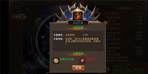 天星技能:进行攻击时,有1%的概率触发效果,恢复自身生命上限30%的生命值,该效果的冷却时间为60秒。