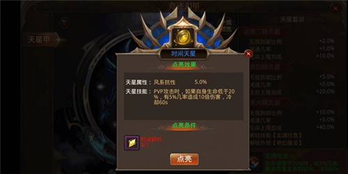 天星技能:攻击时,有1%的概率触发伤害加成提高20%,效果持续5秒,技能冷却时间为60秒。
