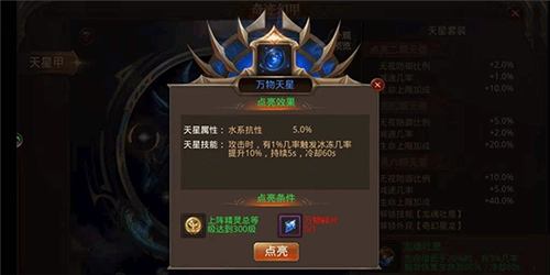 万物天星的点亮条件是:上阵精灵(即我们平时入库的精灵,无论是否携带,其等级都累计计算)的总等级需达到300级,之后再获取一个万物碎片,就能点亮万物天星了。