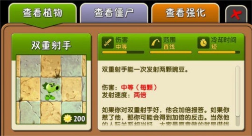 2、其他情况下双向射手的作用比较有限,要是没有冰属性武器,用来对付淘金僵尸(就是那个拿着炸药的)还勉强可以,但在其他关卡里最好谨慎使用。最后需要注意的一点是裂荚射手的爆发能力:正面会发射一颗豌豆,背面则是双发豌豆,不过大多数时候派不上用场。