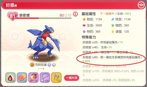 精灵的好感度不仅能提升自身属性与速度,80级的好感度还藏着特别的机制。比如现在龙系精灵很常用,我们可以筛选出所有龙系精灵,当它们的好感度达到80级时,会为第一属性是龙系的精灵增加0.60%的基础属性,这数值看似不高,但实际能提升不少速度。同样的道理,如果上阵的是其他属性的精灵,给那些没上阵的S、A、B级精灵提升好感度,也能增加主队中同属性精灵的战力和速度。