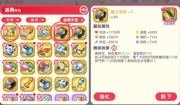 目前加速度的携带品有不朽之剑、强力手环。紫色携带品里王者之证也加些速度,但和它们比起来速度差距还是挺明显的。经常有人问我,橙色携带品到底要突破到几阶?其实橙携里除了强力手环和极巨腕带需要+2才能在第二回合释放必杀外,其他的并没有特别的突破要求,突破主要就是为了让速度更快些。不过就目前来看,超级裂空座和美洛耶塔对速度类携带品的需求非常大,而且是突破越高越好的那种。