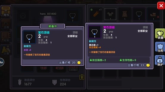 1、武器装备:每位勇者可配备三件武器与六件防具,各类武器具备不同的攻击弹道及频率,武器升级后还会激活特殊效果;防具的稀有度划分为白、蓝、紫、金和暗金(红),每件暗金防具均带有独特的被动效果,能够形成专属的被动技能组合。