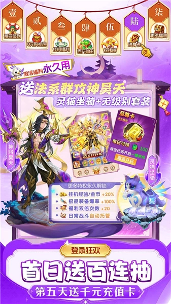 【登录狂欢】首日送百连抽,第五天送千元充值卡。