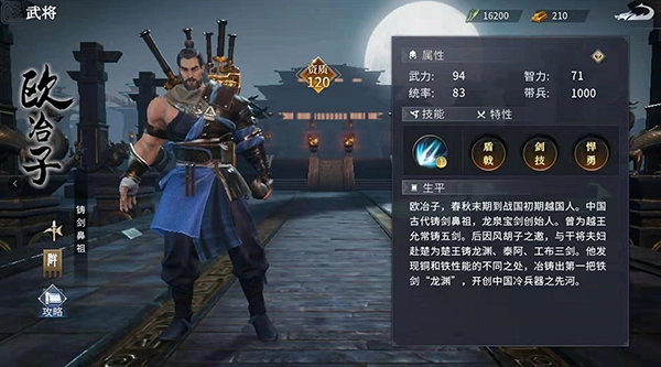 在游戏里,欧冶子的人物建模身后背着五把自己铸造的名剑,他的特性剑技也和这些剑紧密相关。解锁该特性后,欧冶子会佩戴三把亲手铸造的名剑——湛卢、龙渊与赤霄,每把剑都对应着独特的战斗属性:湛卢能提升欧冶子的武力伤害,龙渊可在他生命值偏低时触发生命夺取效果,赤霄则有概率让敌人在战斗中缴械。凭借这三把剑,欧冶子同时具备了输出、防护和战术三种能力,因此是后期相当值得培养的武将。