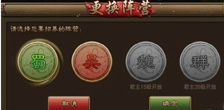 当您阵营中的武将数量达到一定规模后,便可以选择更换并招募其他阵营的武将。例如,若您选择的是蜀国阵营,系统会在君主等级达到10级、15级、20级时,依次开放吴国、魏国、群雄阵营的招募权限。具体的开放阵营及对应等级,将根据您当前所在的阵营来确定。