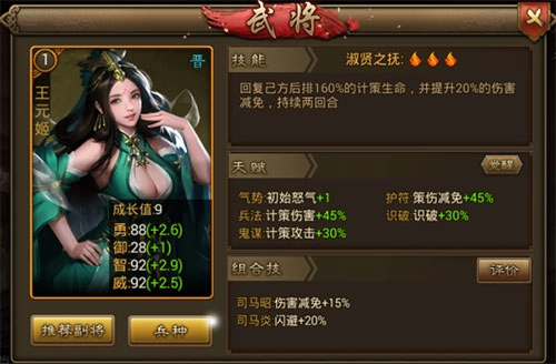 晋武阵营的武将们防御属性普遍偏低,但司马昭与王元姬这对夫妻组合却能大幅减免伤害,生存能力极强。司马昭的技能可对敌方后排造成300%的计策伤害,兼具坦度与输出能力;王元姬则能为后排恢复生命值,并提升20%的伤害减免效果,后排武将们不妨多多依赖这位文明皇后的庇护!