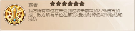 霸者是关卡章节的神器,己方前两次攻击能增加高额伤害,敌方前两次受击前会被大幅减防。因为关卡中己方都是先手,所以这个将台天生就只适合刷图;要是用于PK,就特别依赖先手值,而且会被同为金色将台的舞曲彻底克制。尽管如此,它还是很适合平民使用,不过制作代价不小,得仔细考虑;土豪的话,建议做出来推图,也能用来凑羁绊提升战力。