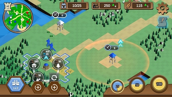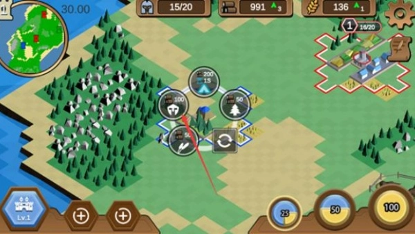 你可以建造伐木场、农田和兵营,分别获取木材、粮食与士兵。木材用于建筑的建造和升级,粮食是产出士兵的基础,兵营则负责训练士兵。因此,玩家需要在这三种建筑及对应的资源之间进行权衡,从而制定出最优的策略。