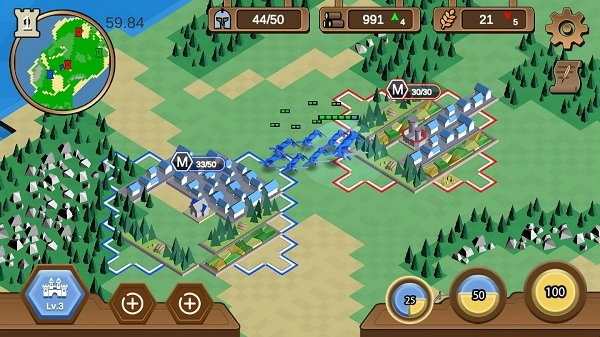 之后持续循环放置土地与士兵,前往不同区域发起攻击以获取更多土地用于放置。到了后期,能够研发科技来提升部队的战斗力,与此同时,还需留意外交关系,和其他玩家结盟,一同对抗强大的敌人。