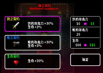 在各个迷宫里,有一种血之契,玩家可以通过献出自己的鲜血,在进入死亡状态前获得力量的提升。