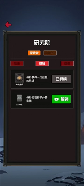 1、打开消灭塔哥,进入研究院界面后,能够解锁探险者或恶魔守卫的部分技能,涵盖攻击、赚钱、防御等属性,玩家可依据自身需求进行选择。
