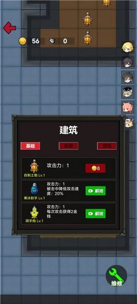 7、房间空地上还能搭建自制土炮、寒冰射手、顺手炮这类基础建筑,不同建筑具备不同属性,并且这些建筑也支持升级。