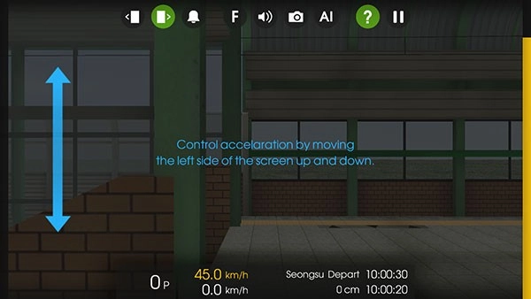 玩家把右侧的黄色减速条拉到0,左侧加速条调整到1到5档之间,列车就能启动了。等列车抵达目的地后,得停在标准线范围内才能打开车门上下乘客,可别错过站台啦!