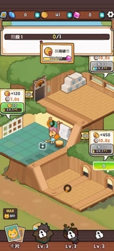 2、里面有非常多的小镇,每次完成任务后,就能解锁猫咪卡片,把猫咪卡片放置好,加工过程就会实现自动化。每张猫咪卡片都有不一样的加成效果,你既可以自己搭配摆放,也能让系统智能地进行放置。