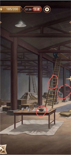 3、第三张图的线索包括桌上的书本、木梯以及一根石柱。
