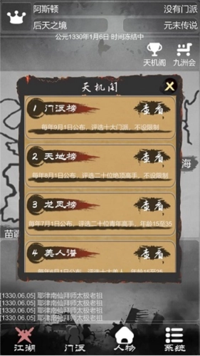 目前玩家在当前场景(比如中原地图)只有两种选择:探索或修炼,二者只能选其一,选了一个另一个就会暂停。先修炼的话,等战力到200左右差不多就到大会时间了,参加大会时,虽然第一名有一千九百多战力,但他肯定会输。新年奖品是必拿的,拿到后会自动使用并增加你的资源,这时你就能在场景里随意逛逛,然后去打劫。一般打劫成功能得到非常多的物品。