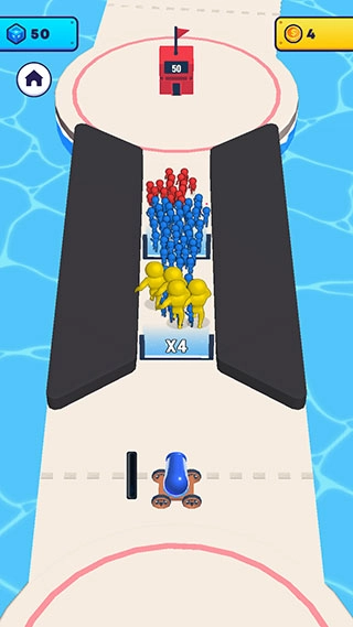 3、由于不同关卡中倍增门槛的位置存在差异,玩家需要不断移动火炮至指定位置进行发射,以此实现火柴人角色的成本增长。