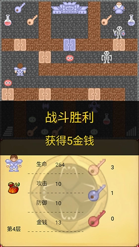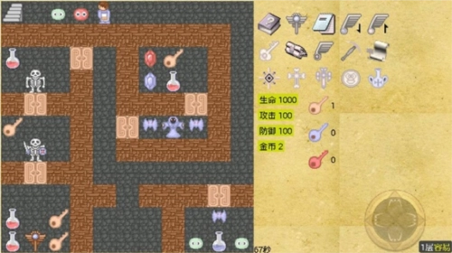 2、基本操作方式:玩家可通过点击屏幕来控制角色移动,接触到物品时会自动完成拾取,其中部分物品会出现在物品栏中,供玩家随时使用。当遇到怪物时,角色会自动发起攻击;若未进行攻击,则意味着这场战斗可能导致角色HP降至0以下,从而使角色死亡。本作品改编自元祖魔塔,力求重现其经典的游戏体验。