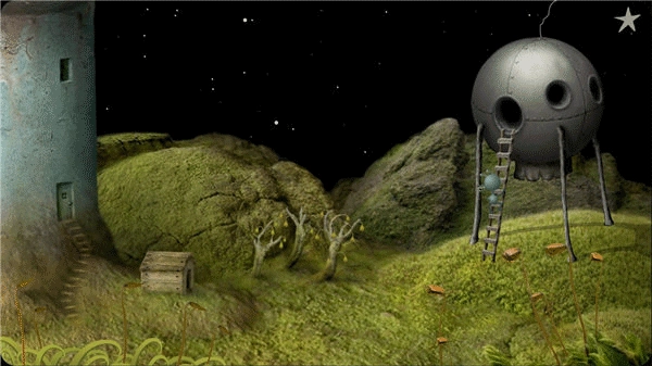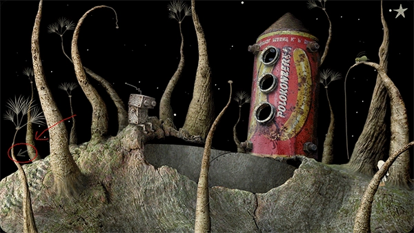 首先要帮这个人找到烟斗。点击斗笠上的铃铛,把它挂到那只鸟停留的树枝左端,等鸟飞起来的时候,点击它的鸟窝,烟斗就会掉下来。接着把烟斗递给这个人。之后还要帮他找烟袋。点击这个人坐着的树桩下面的洞,狗会跑进洞里。当狗跑到怪物面前停下时,点击狗身后的植物,狗就会嘘嘘,植物随之长高(这个设计挺有意思的)。然后点击左边的水塘,狗会跑过去喝水,回来后再点击植物。这样重复两三次,植物长到顶端会出现一个洞,点击洞里的骨头,把它给怪兽。烟袋藏在怪物身后的草堆里,找到烟袋后拿上来递给这个人。当这个人点烟时,会放出上面灯里的小飞虫,点击小飞虫,它就会为小人领路,这样就能过关了。