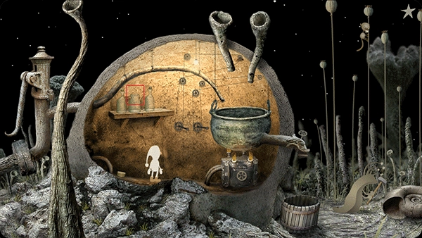 3、小人回到中间的房间,转动墙上中间的两个机关。点击右边的虫子,让它跳到最右边的树上,再点击它跳到最左边的树上,这样粉就会撒入房间的锅子里。接着点击房外左边那个像水泵一样的机关几下,水流就会流进中间房间的锅子里。