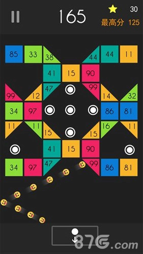 3、玩家瞄准后松开手指,球球便会顺着瞄准线的方向发射出去。发射出的圆球会在方块之间、方块与墙壁之间来回反弹,持续削减方块上的数字,直至方块被消除或者圆球弹回地面。