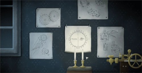 可以看到几张设计图,其中没有任何解谜相关的内容。这些设计图的成品是白乌鸦的替代品,玩家2在这个房间里就能看到它,而它的名字“Kol”本身就是一个谜题。