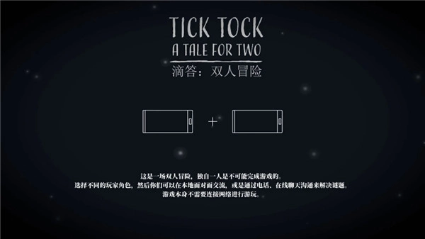 TickTock是一款趣味十足、融合闯关元素的冒险解谜游戏,其画面采用充满欧式风情的手绘画风,整体以黑色调为主,具有强烈的沉浸感。你和朋友被困在一个神秘的钟表世界中,随着时间流逝,必须解开越来越复杂的谜题才能逃脱。合作至关重要,因为你们两人都无法看到完整的画面!无论是在本地还是通过远程两台设备游玩,只需一个语音连接即可。
