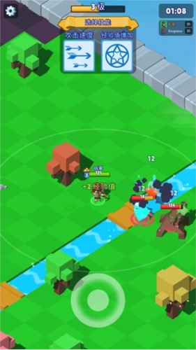 1、竖屏界面设有虚拟摇杆,通过滑动屏幕可在攻击范围内操控角色移动,角色停止移动后会自动发起攻击;