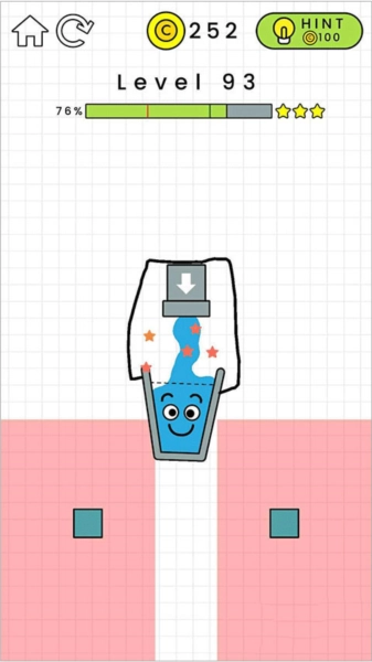 第93关难度不大,借助水管,让线条引导水流到玻璃杯里,就能顺利完成接水任务。