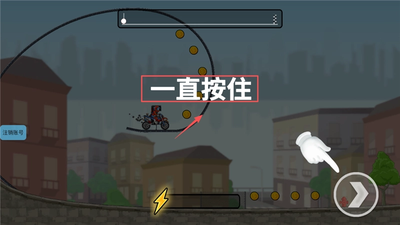 1、进入游戏后,你会看到角色正骑着摩托车行驶在赛道上,画面上方显示着进度条和金币,需要注意的是要一直按住屏幕,这样才能保持动力让摩托车持续前进。