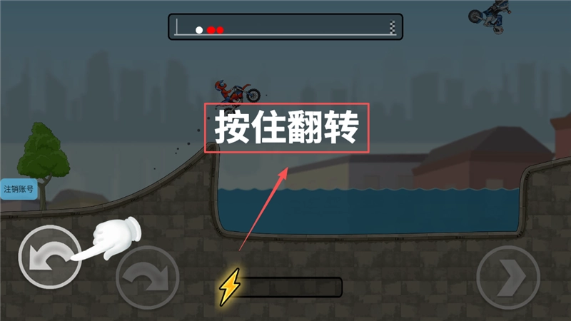 2、当遇到图中所示的坡道时,留意屏幕下方会弹出“按住翻转”的提示,按照提示操作来翻转车身即可,但要掌握好时机,否则可能会坠入水中。