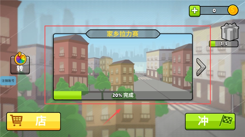 4、在家乡拉力赛板块里,进度显示完成了20%,旁边的礼物盒图标标注着1/5。界面左上角有个带有“转”字的彩色按钮。
