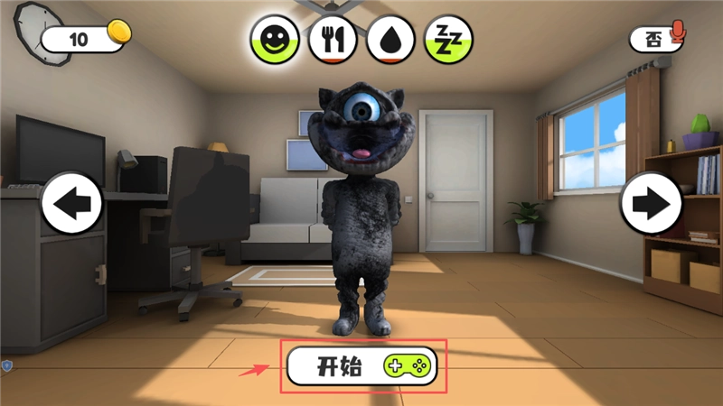 1、首先打开软件会看到一只怪猫,注意观察它上方的笑脸、水滴等状态图标,同时别忽略左上角显示的金币数量,点击怪猫面前的“开始”按钮即可正式进入游戏。
