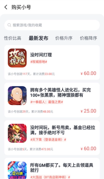 4、比如点击“购买”按钮,就能看到其他玩家发布的各类信息,包括所在区服和对应的价格。