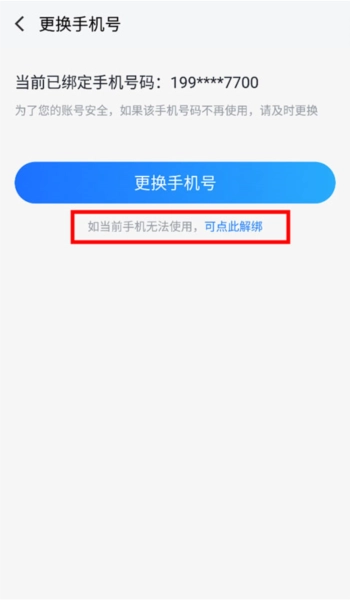 3、接着在更换号的下方,点击“若当前无法使用,可点此解绑”。