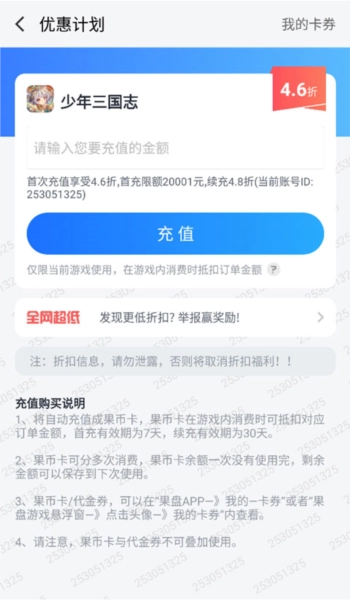 1、充值金额将兑换为等额果币卡,果币卡可用于抵扣后续充值订单。