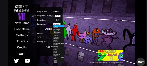 1、启动程序后,在主界面的左侧区域找到【settings】设置图标,点击该图标即可进入设置页面,此页面涵盖了语言、音效、画质等多种基础设置选项。
