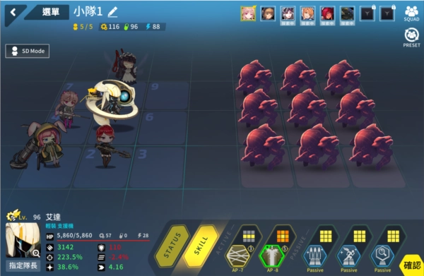 该游戏的战斗采用九宫格回合制模式,我方最多可派出5名角色参与战斗。每名角色配备两个主动技能,被动技能数量根据角色稀有度有所不同,为0到3个不等。此外,每个角色还能穿戴4件装备。