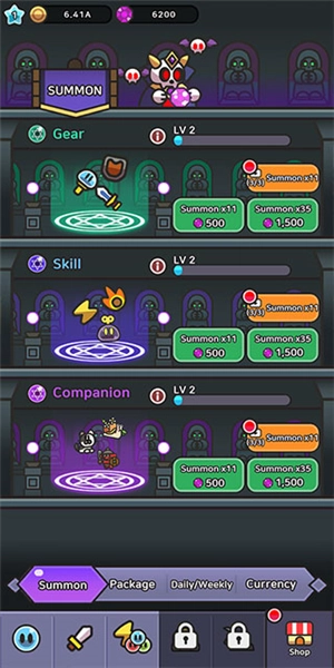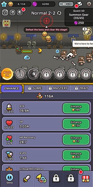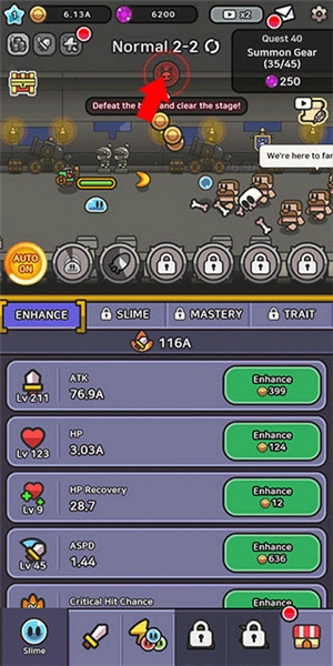 4、接着点击召唤按钮就能抽取并升级我们的武器,要是任务失败也不用担忧,只需将其放置在那里挂机提升史莱姆的属性就可以了。