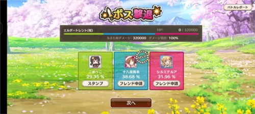 一开始我还在琢磨怎么才能撑到最后不死,但试了几次后发现,只要练度达到图里那样,我觉得甚至可以不带奶妈——前提是练度足够,而且得利用好克制属性的减伤效果。(不过也说不定是因为第一次遇到的BOSS本身就比较弱啦=3=)