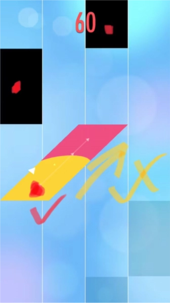 2、(此条仅针对拇指操作的玩家)钢琴块初始阶段有四条轨道,务必养成左手负责左侧两道、右手负责右侧两道的习惯,这一习惯必须刻意培养。无论眼前的黑块下落速度多快,都不能因来不及按而跨轨道操作,那样只会让你更快失误。请务必牢记并遵守这一规则。
