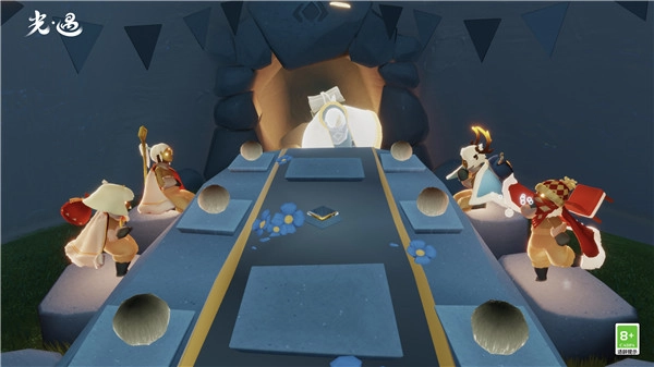找到蓝色的人影并触碰它,随后跟着光点走,就能看到一尊深灰色的石像。点燃石像上的火苗后,它会教我们一个新的互动姿势。