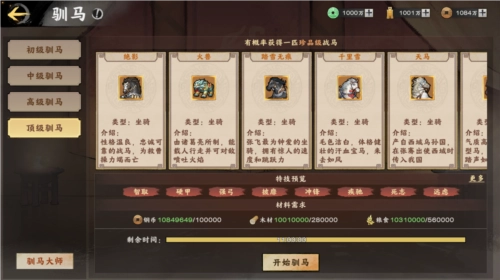 当主城等级提升至9级且解锁马厩后,即可前往马厩,消耗基础资源进行驯马以获取马匹。